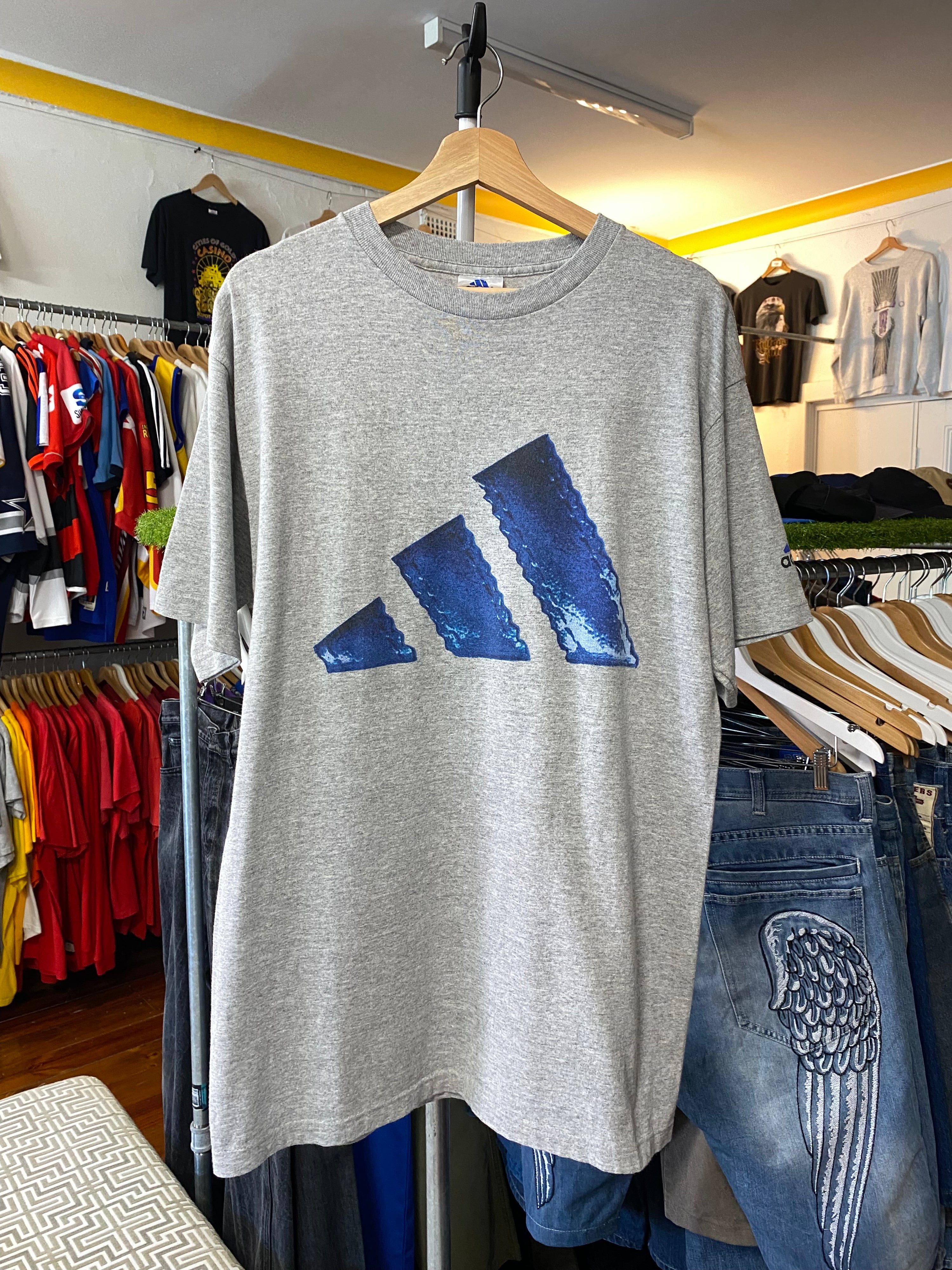 M - Vintage Adidas Big Blue Logo Grey Tee